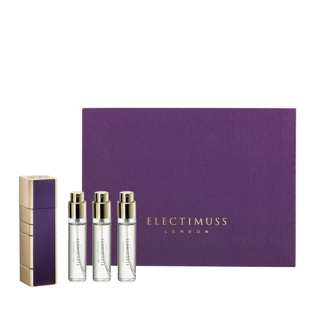El set Aquila Absolute incluye un atomizador de viaje y tres sprays de 10 ml para que puedas llevar tus fragancias favoritas de Electimuss a dondequiera que viajes.